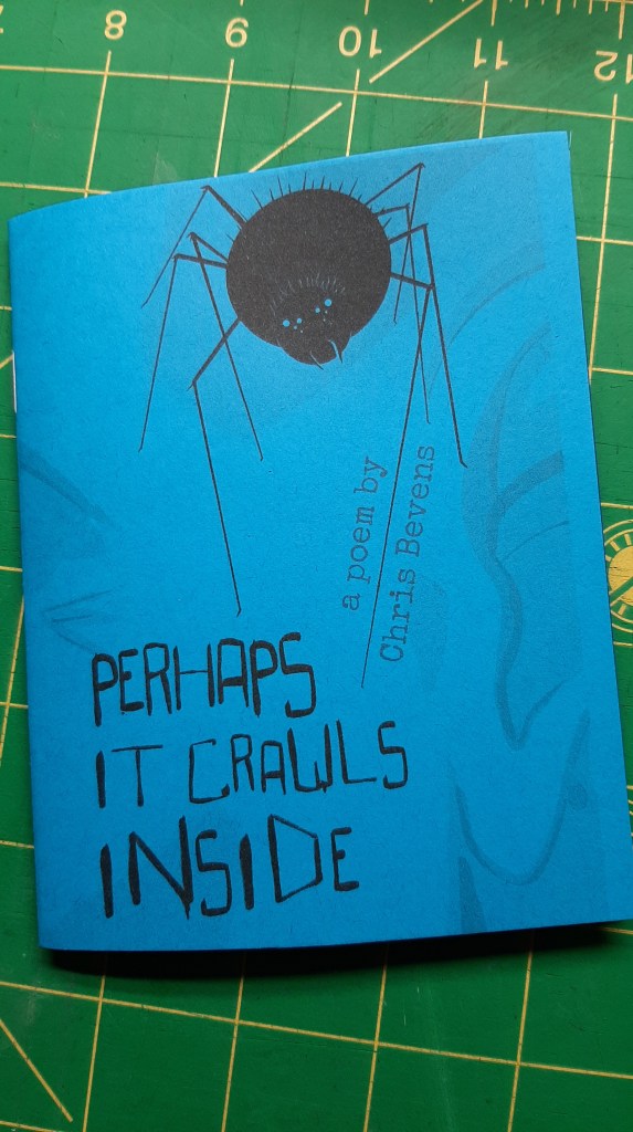 Here in the PNW we have something called spider season, it begins about when autumn begins, and without giving anything else away, this Little Free Chapbook is inspired by spider season. Perhaps It Crawls Inside, features a spider by good friend Glenn, that’s with two n’s. My own partner still won’t let me finish reciting it aloud, calling it too creepy. Sounds just right!